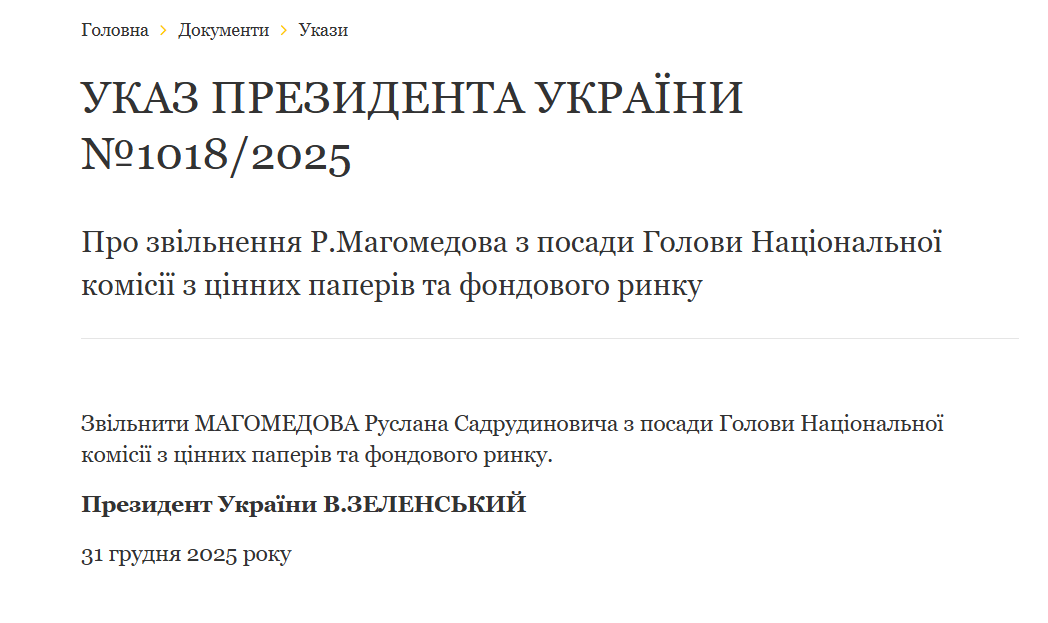 «Звільнити Магомедова Руслана Садрудиновича з посади Голови Національної комісії з цінних паперів та фондового ринку», – йдеться в указі.
